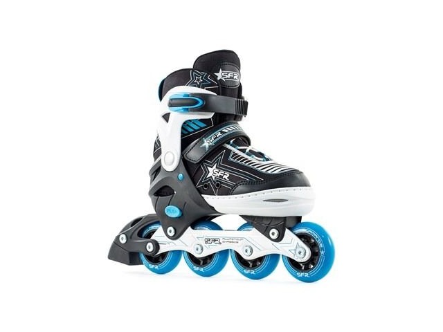 | Description | The SFR Pulsar is a semi-soft, size-adjustable inline skate. Available in 3 great colours! Children's semi-soft adjustable inline Easy to use size adjuster in the heel Aluminium chassis ABEC 5 bearings Wheel Sizes: 64 x 22mm PU Cast for Small 70 x 22mm PU Cast for Medium 72 x 22mm PU Cast for Large |