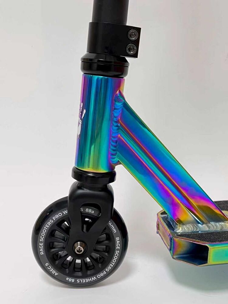 | Description | 4.3" x 18" Boxed channel deck Neochrome plate 19"W x 21"H Chromesteel T bar, Threadless headset 140mm Black grips Impact resistant bar ends Dual bolt clamp Threadless steel fork Chrome steel brake 100mm Nylon core 88a wheels Abec 9 Carbon steel bearings |