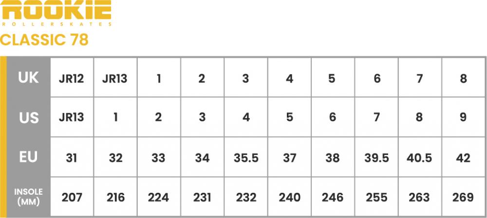 | Description | The Rookie Classic 78 celebrates the brands 40+ years creating quality rollerskates. Available in 4 beautiful colours, there is something for everyone. Featuring embossed Classic 78 logos on the boot and tongue, extra padded fleece lining and a perforated breathable tongue. The Classic 78 range combines the classic boot style with a modern colourful twist. Upper: Synthetic padded soft boot with fleece lining Wheels: PU cast 58 x 32mm 82a Chassis: Nylon Trucks: Nylon Toestop: PU cast Cushions: PU cast 88a Vegan Friendly Max Weight UK 2-5 / EU 34-38: 60kg UK 6+ / EU 39.5+ : 100kg |